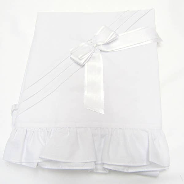 Sweet white blanket, has white satin ribbon bow detail. Perfect to match some christening dresses and gowns. Poly cotton.