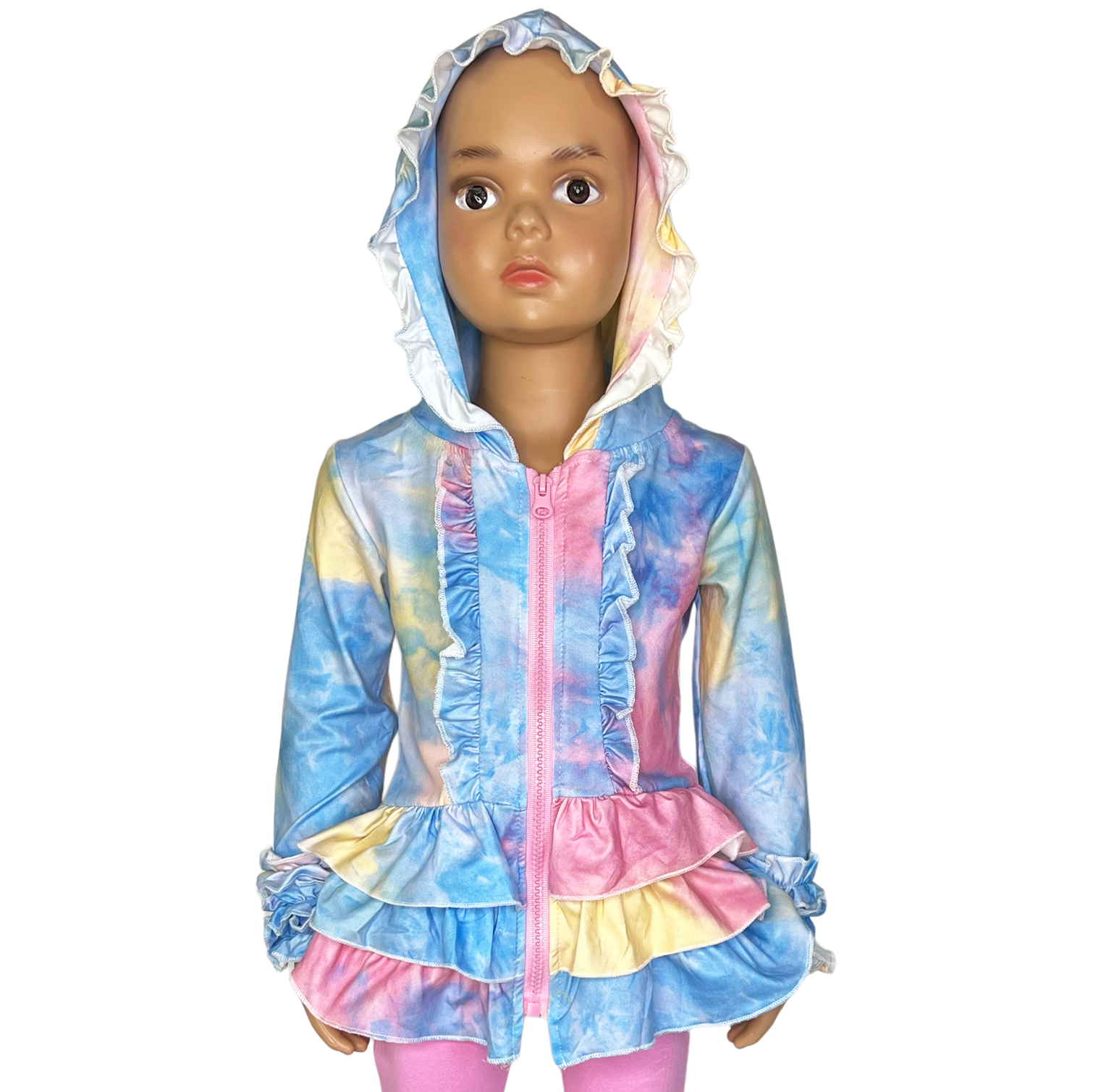 Boutique Tie Dye Pink Blue Yellow Ruffle Jacket. Perfect for the All Seasons. Zipper Closure, Ruffle trimmed Hoodie with 3 ruffle layers on the bottom and sleeves.  Tie Dye Hoodie Sweatshirt. Very cozy, comfortable Great for Spring Transition, Camp, Back to School and Every Day! A great staple for every girls closet.