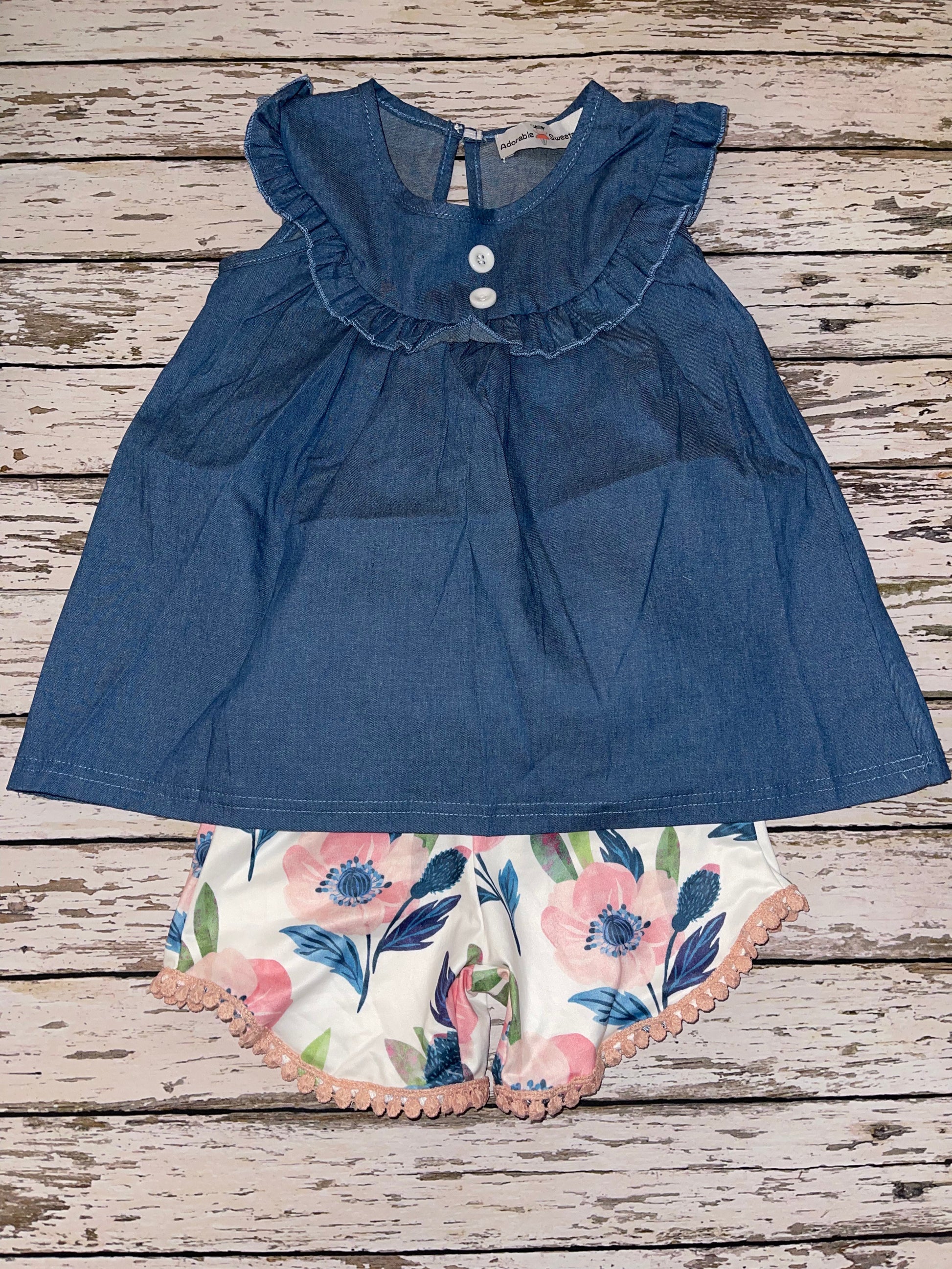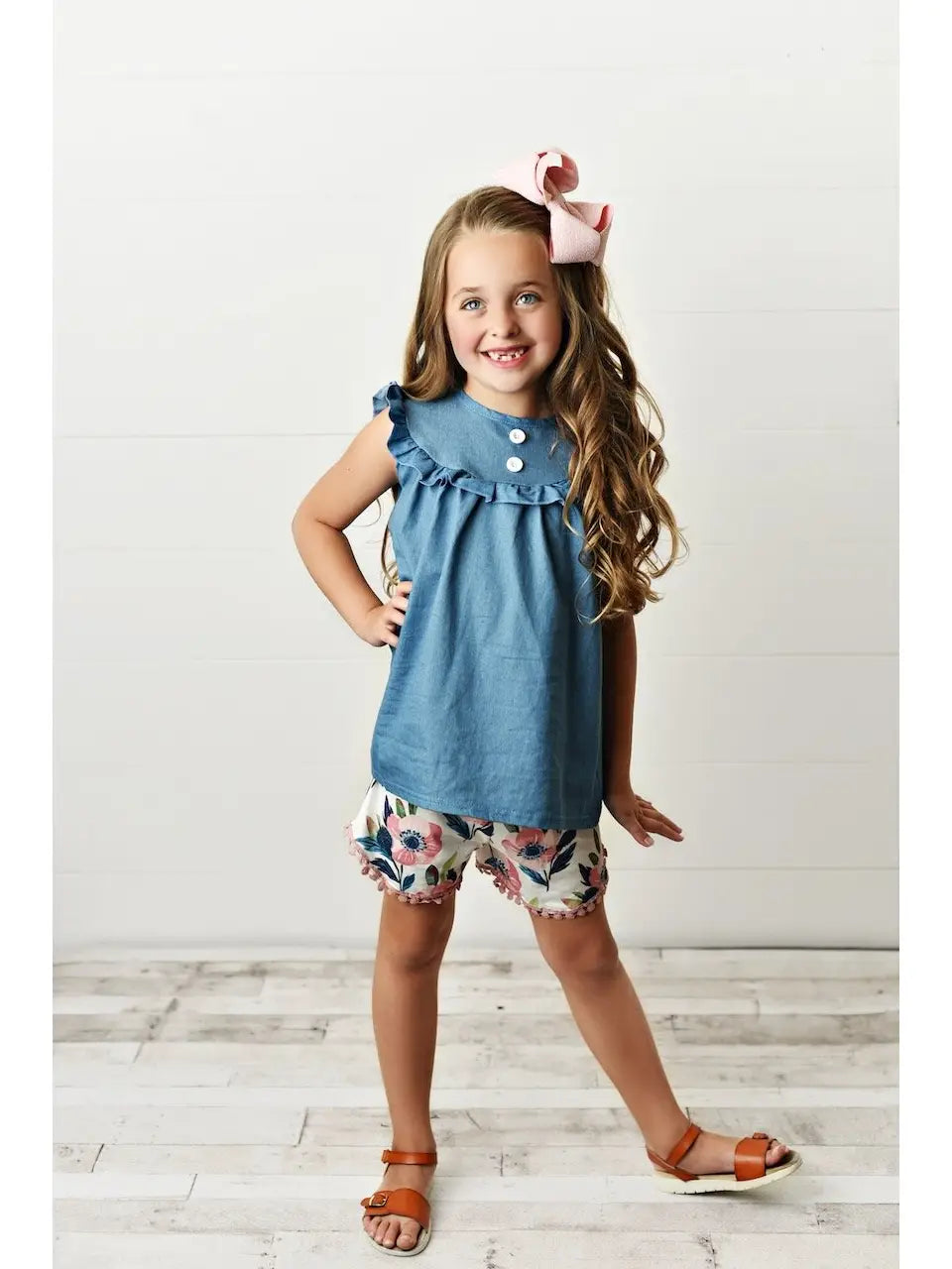 Adorable Sweetness Kids Jean Floral Ruffle Button Summer Two Piece Set