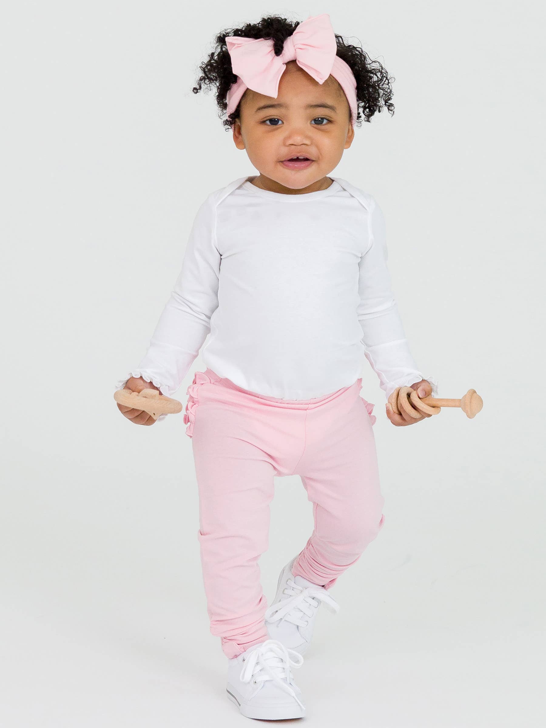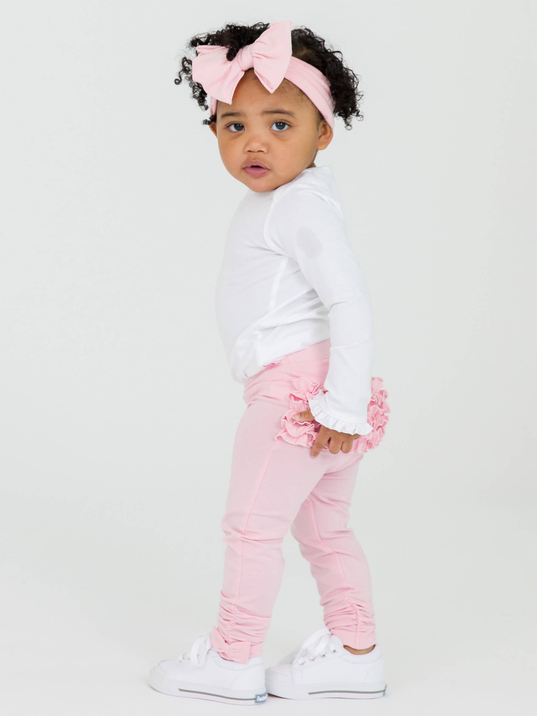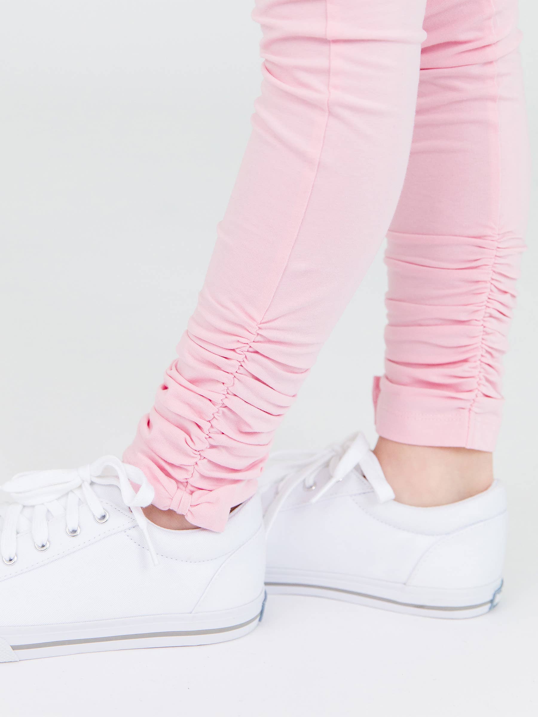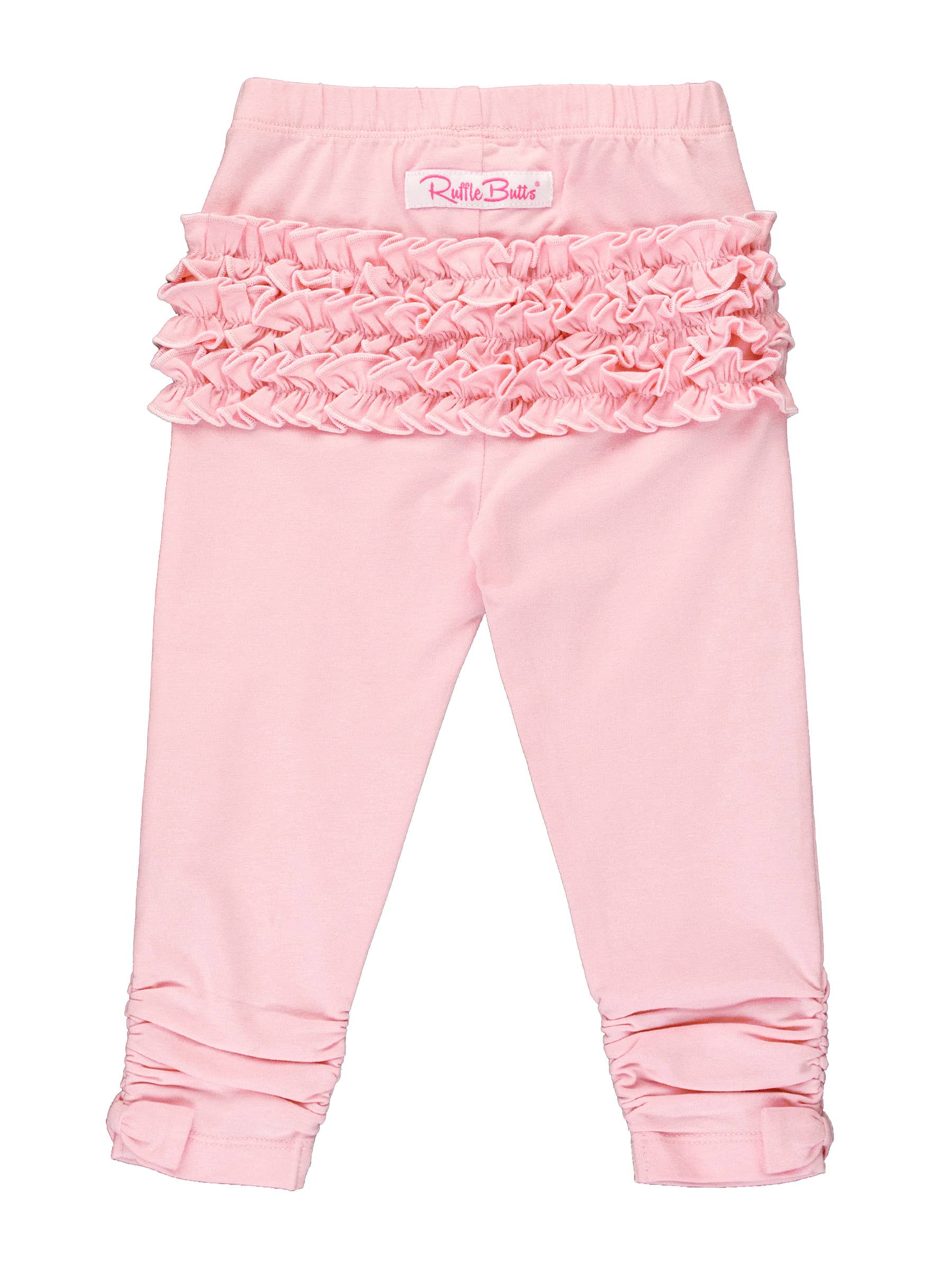 Crafted from soft and stretchy fabric, these leggings feature delightful ruched detailing and a cute bow accent on the ankles. Perfect for everyday wear or adding a touch of charm to any outfit, these leggings offer both comfort and cuteness for a baby's wardrobe.