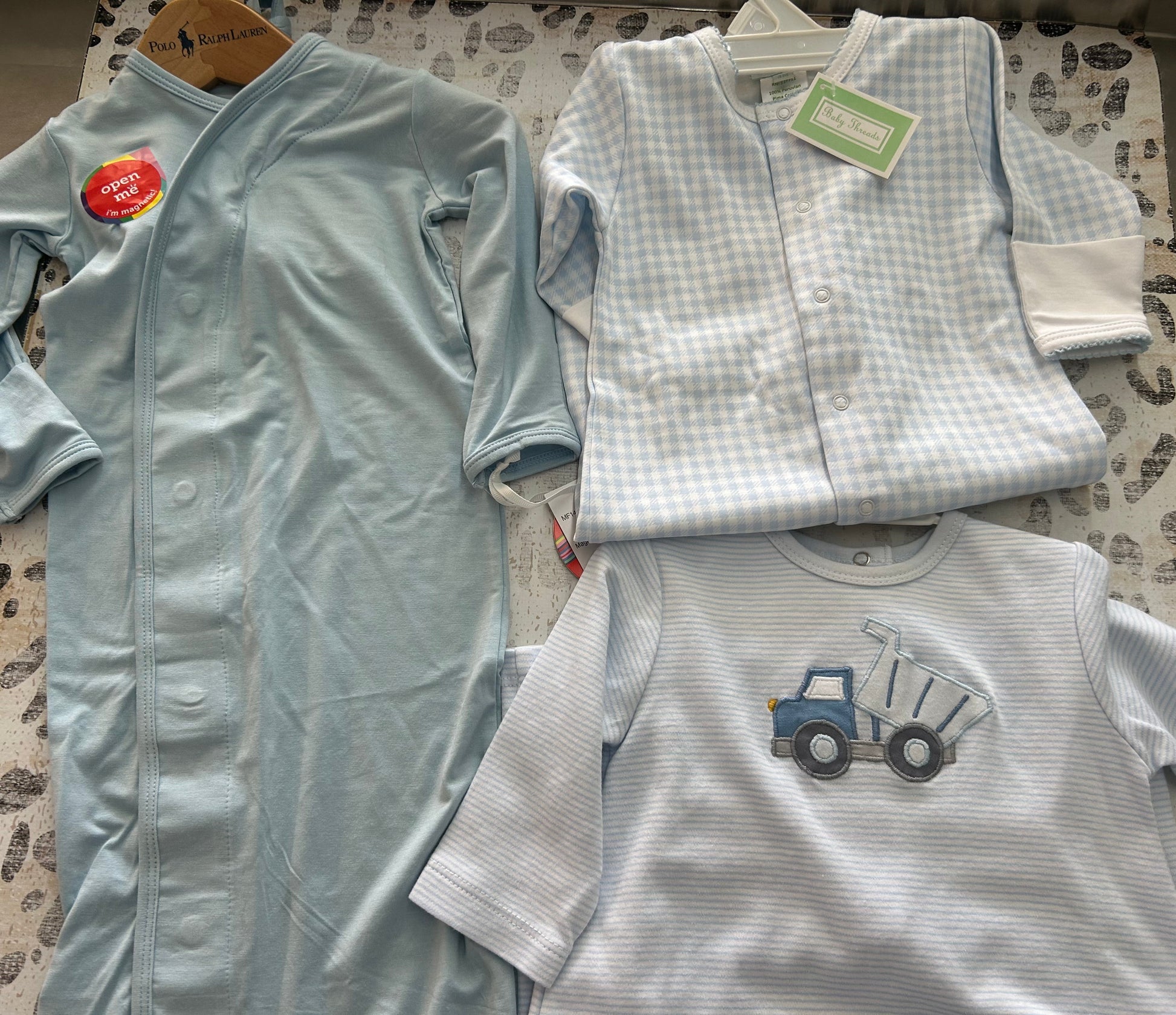 MM Light blue gown, Dump truck romper, Blue gingham romper- Saia Baby