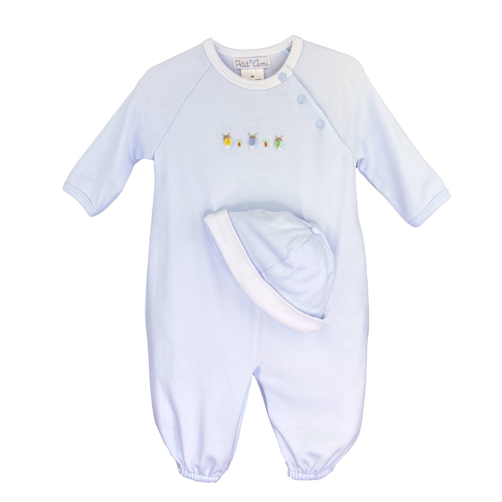 Featuring a delicate light blue interlock knit fabric with adorable bullion embroidered bunnies on the front, this outfit is perfect for babies first Easter! This bag is designed to snap apart at the bottom to convert into a longall, giving you two outfits in one!
