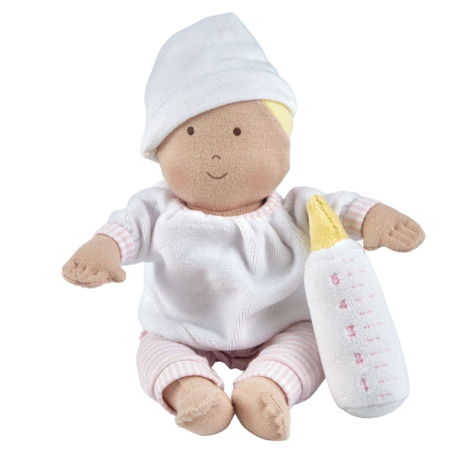 This all natural baby doll set, would make a great first doll for your toddler. Includes a soft huggable baby which is great for snuggles. When she is sleepy you can put her to bed in her own carry cot, tucked up with a cozy baby blanket and bottle for feeding.