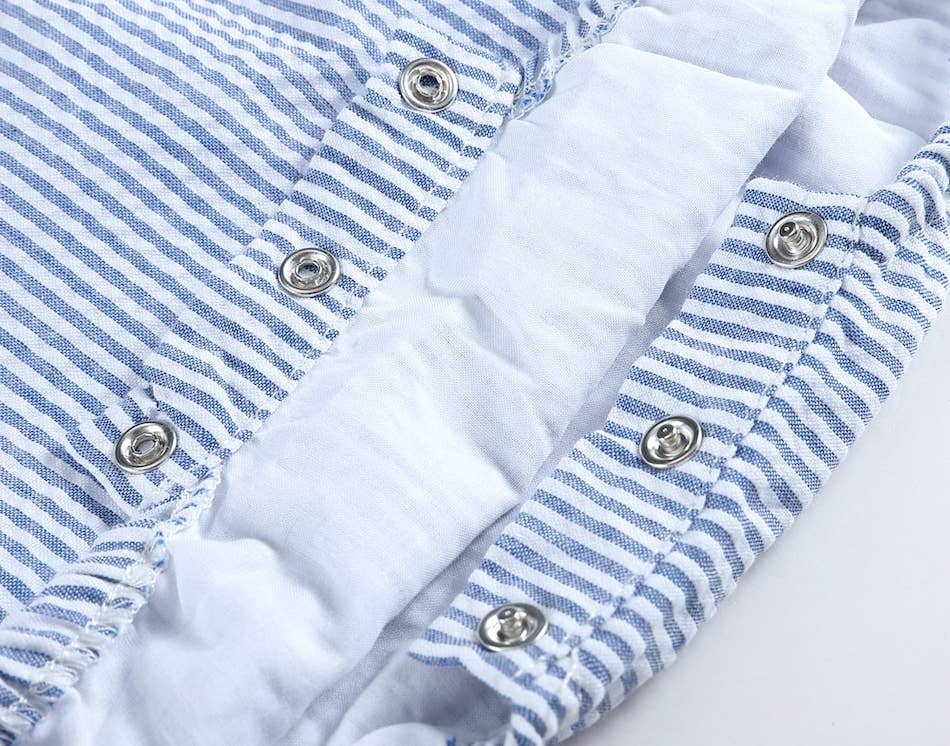 This adorable seersucker romper by Lil Cactus is soft, cool and easy to care for. Perfect to wear as is or ready for your embroidery with its blank front panel. The snaps make it easy for a quick change which is great for you and your cutie.