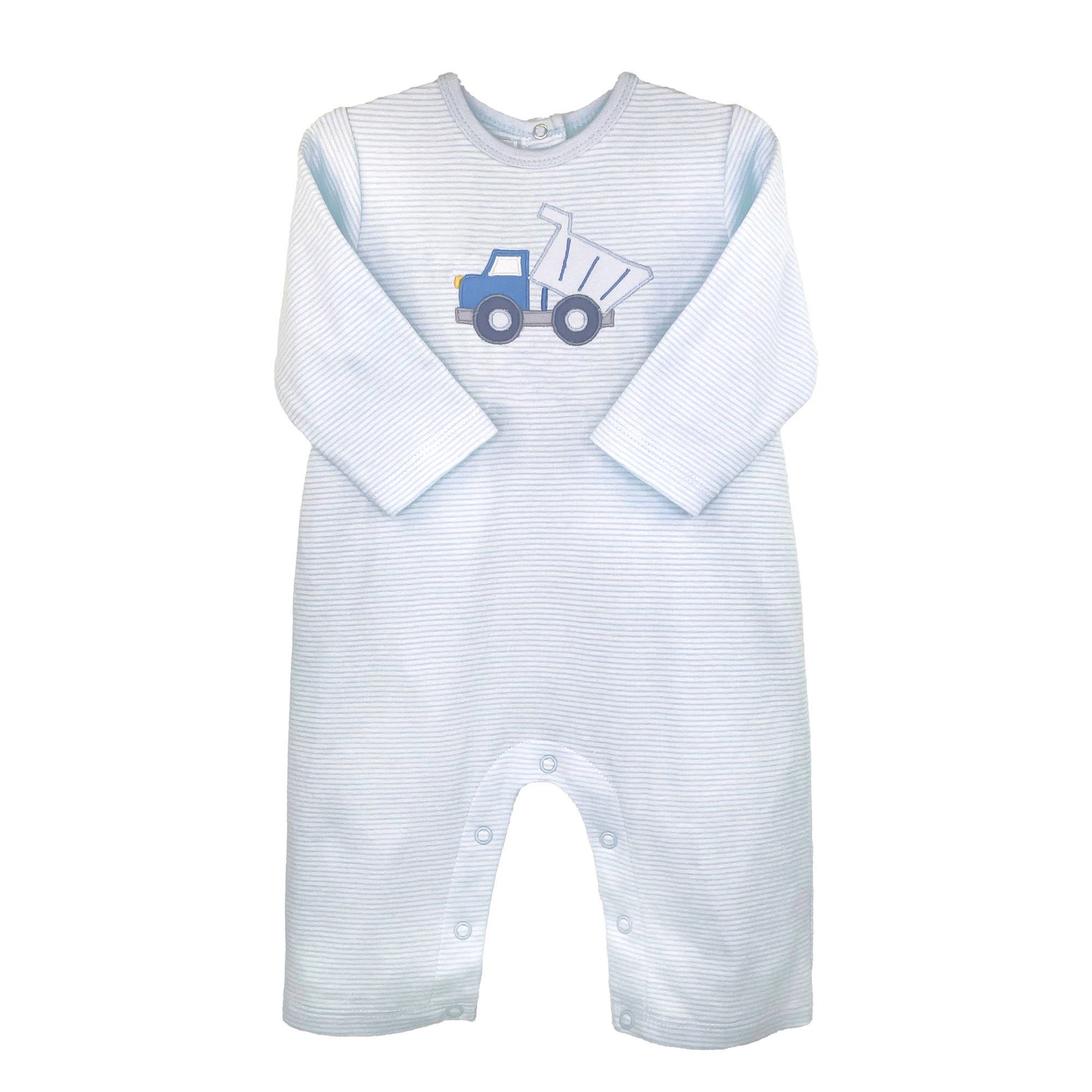 Featuring a delicate light blue striped interlock cotton fabric with an applique dump truck on the front and blue trim for just the right amount of detail. A perfect outfit for little ones on the move!
