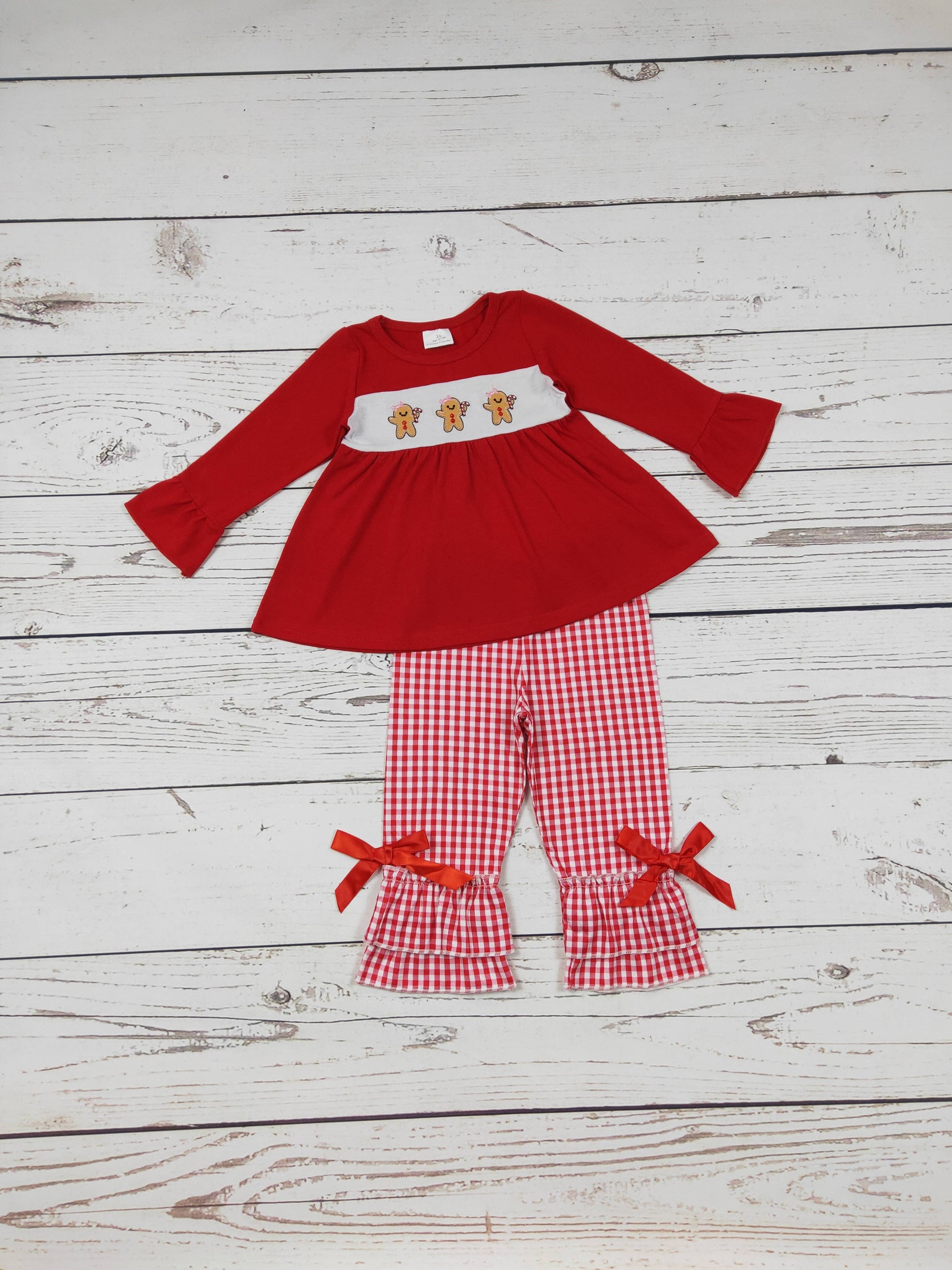 Girls Red Gingerbread Embroidery Christmas Top Pants Set
