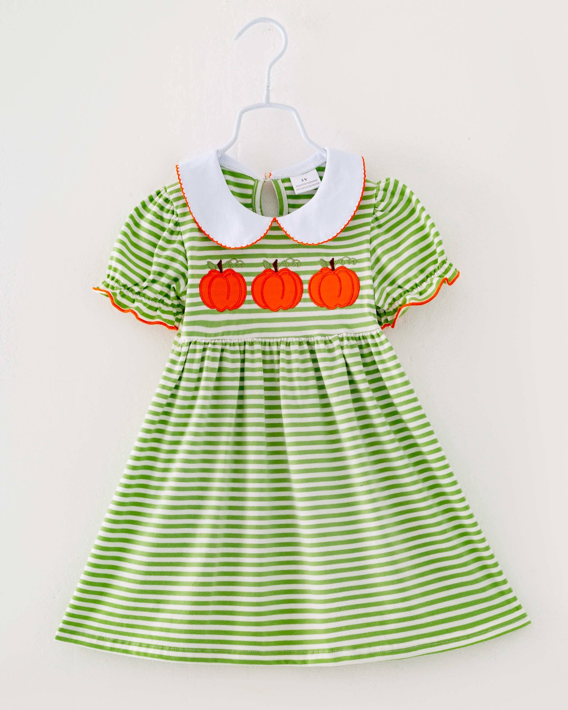 Green Stripe Pumpkin Girl Twirl Fall Dresses Kids Clothes