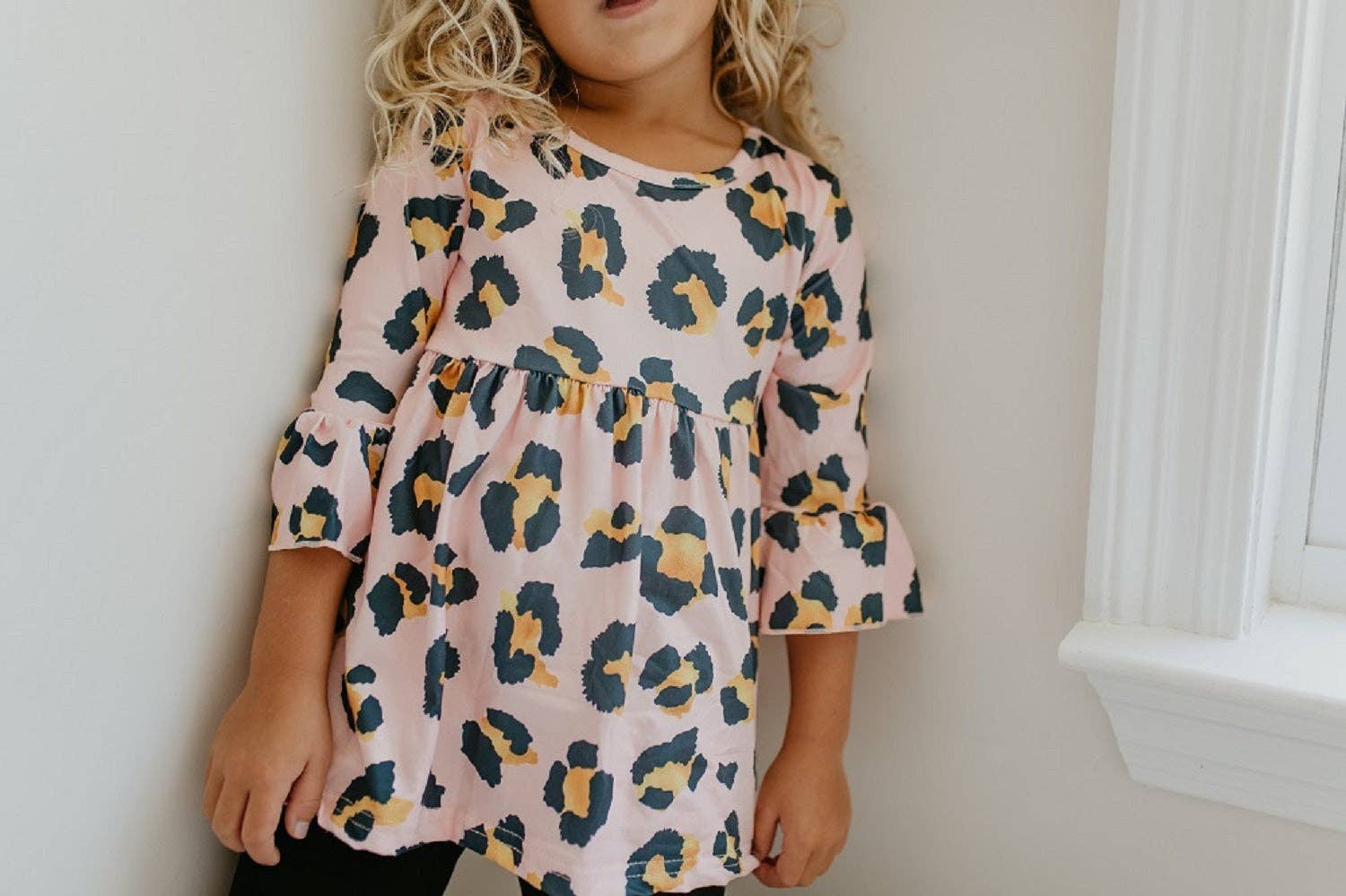 Girls Pink leopard print long sleeve top with ruffle sleeve details. Perfect for everyday looks!