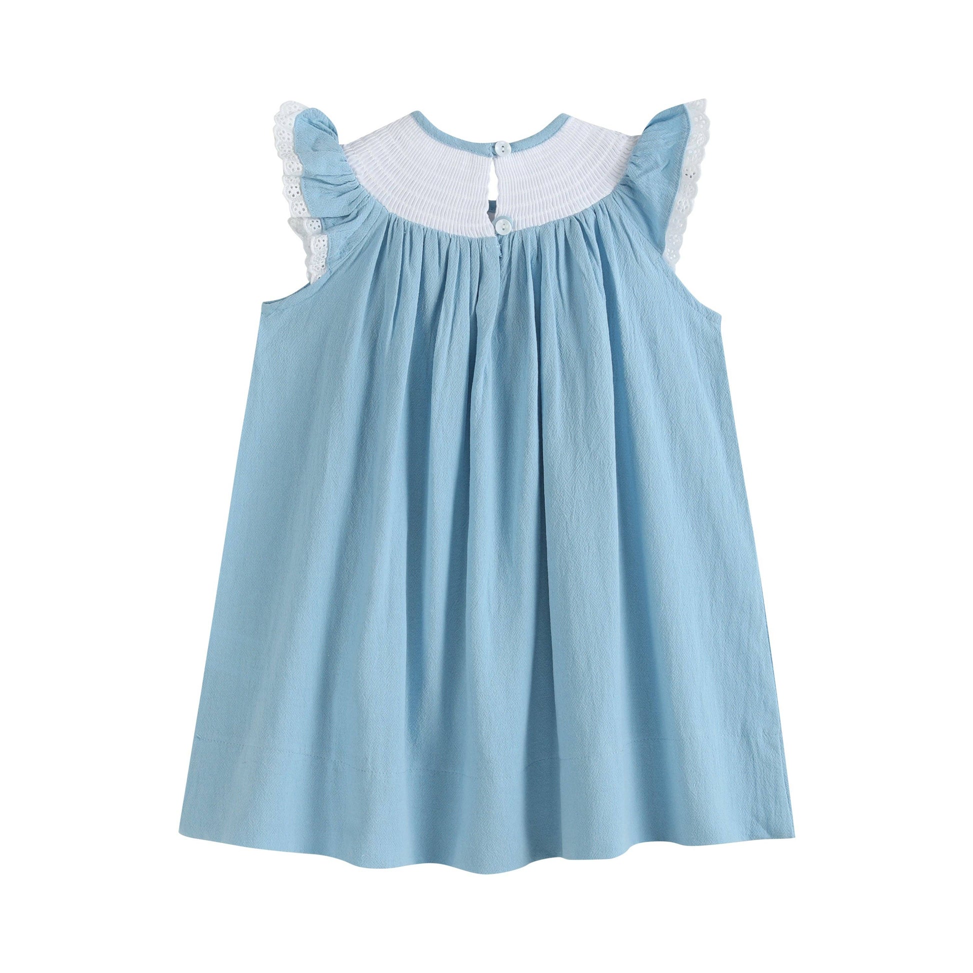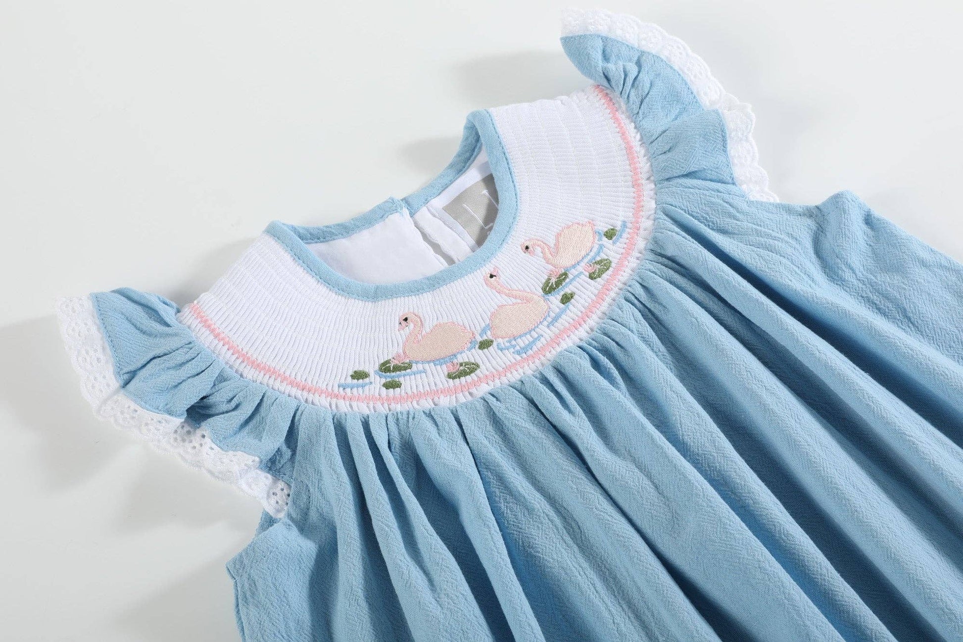 Introducing the enchanting Light Blue Swan Smocked Bishop Dress, a darling ensemble for your little princess. Adorned with delicate smocking around the neckline, charming embroidered swans, and elegant lace detail on the sleeves. Exclusively crafted by Lil Cactus, it's the epitome of grace and style for your little one's special moments.