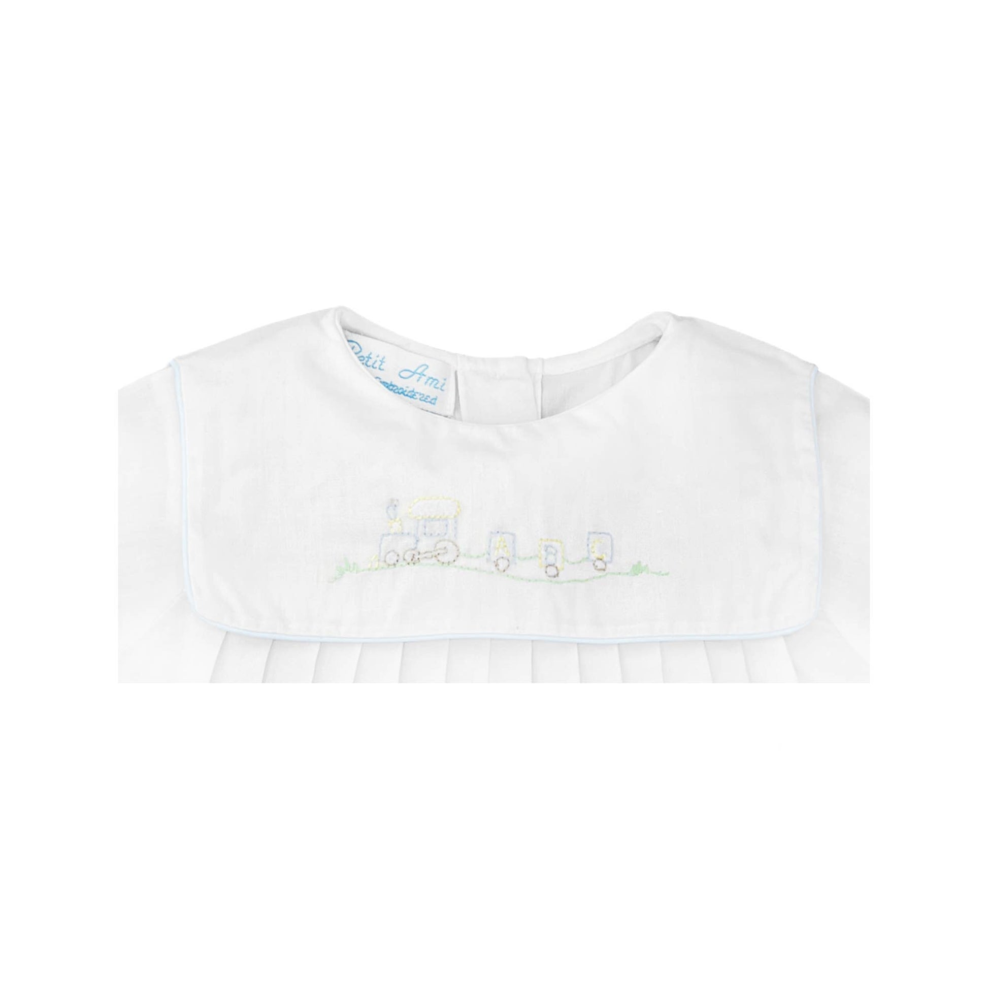 Featuring heirloom-quality handcrafted details like the square collar and shadow stitched train design, this piece is sure to become a treasured keepsake. The shadow stitching is created by tiny hand stitches in which the threads float on the back of the delicate fabric creating a shadow of color on the front.