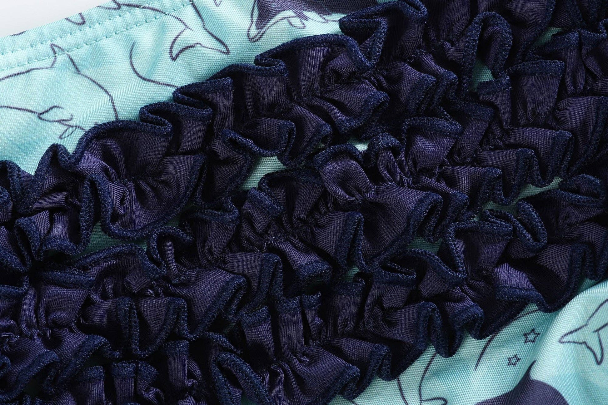 Splish Splash Fun! This adorable Dolphin print 2 piece swimset is detailed with adorable ruffle bottoms and sleeves. Made with long sleeves to offer protection from the sun while still being extremely comfortable. Perfect for your little cutie to spend the day at the beach. UPF50+