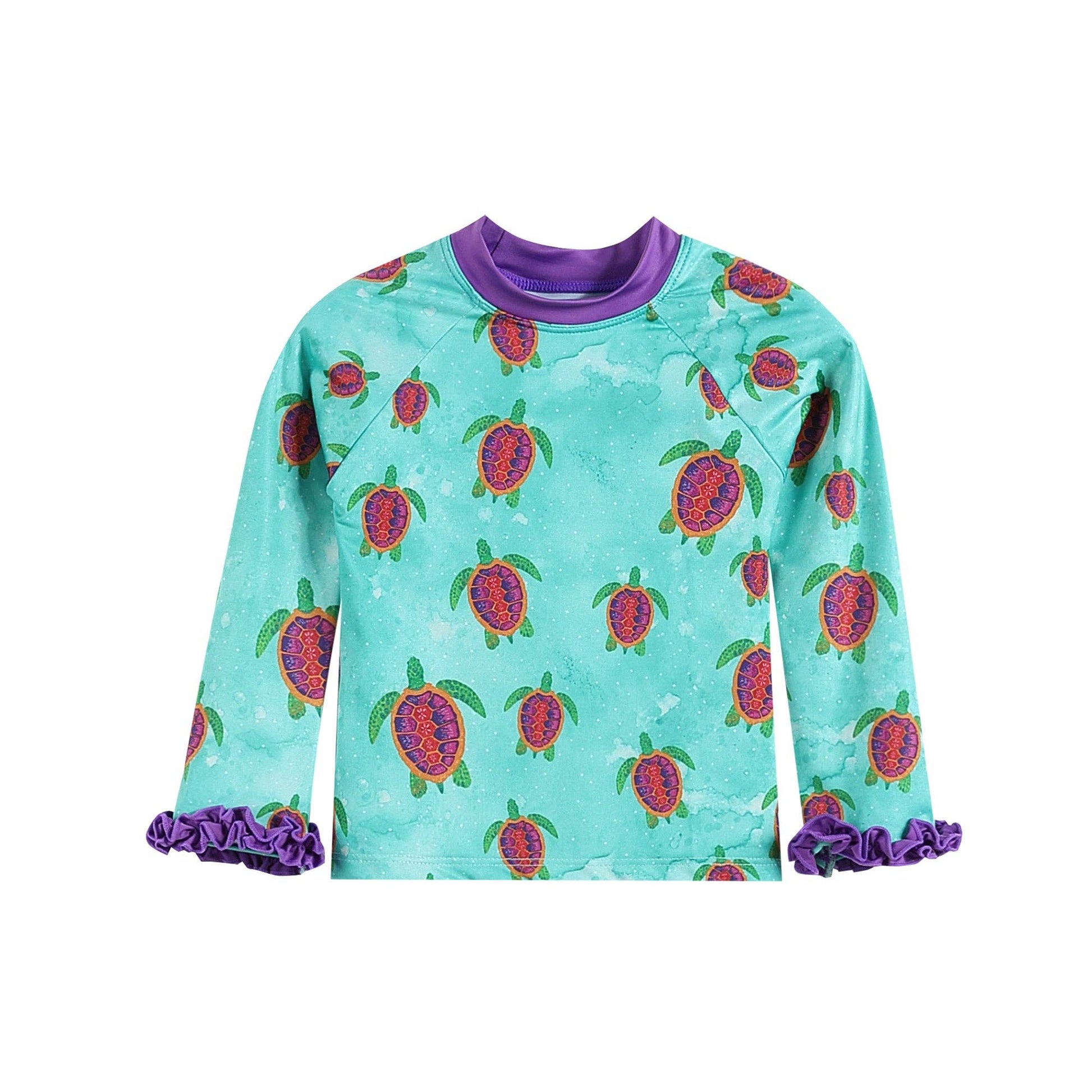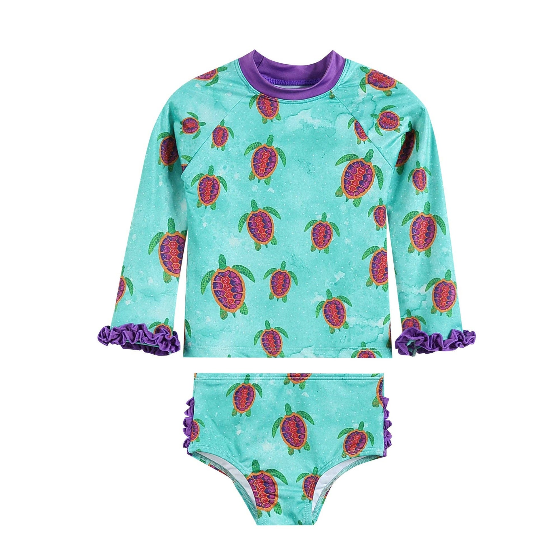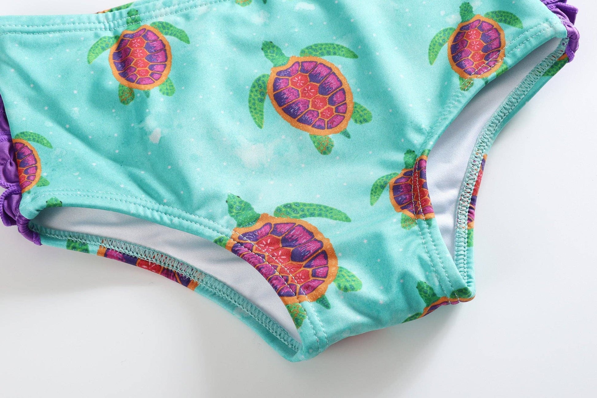 Turtle Time! This cute turquoise turtle print 2 piece set is detailed with sweet ruffles on the bottoms and on sleeves. Your little sweetheart will love splashing around in this cute set and will be ready for summer vacation and fun days playing at the beach. UPF50+