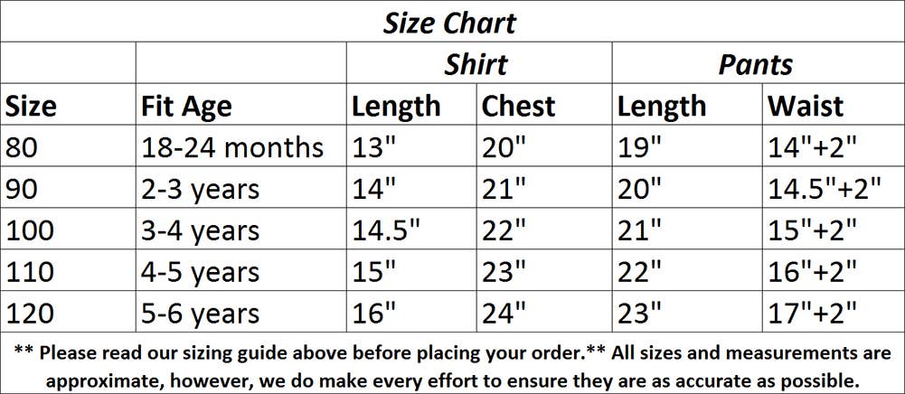 SIZE: 80/6-12 Months; 90/2T; 100/3T; 110/4T; 120/5T